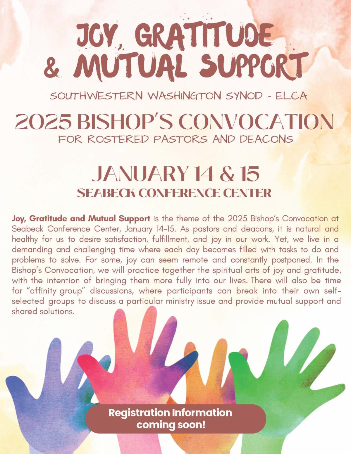 The Synod Youth Day will be held at Gloria Dei Lutheran Church in Olympia, WA on November 23 from 10 am – 2 pm. There is no cost for this event, and you can register (either by youth or as a whole church) at this link.
