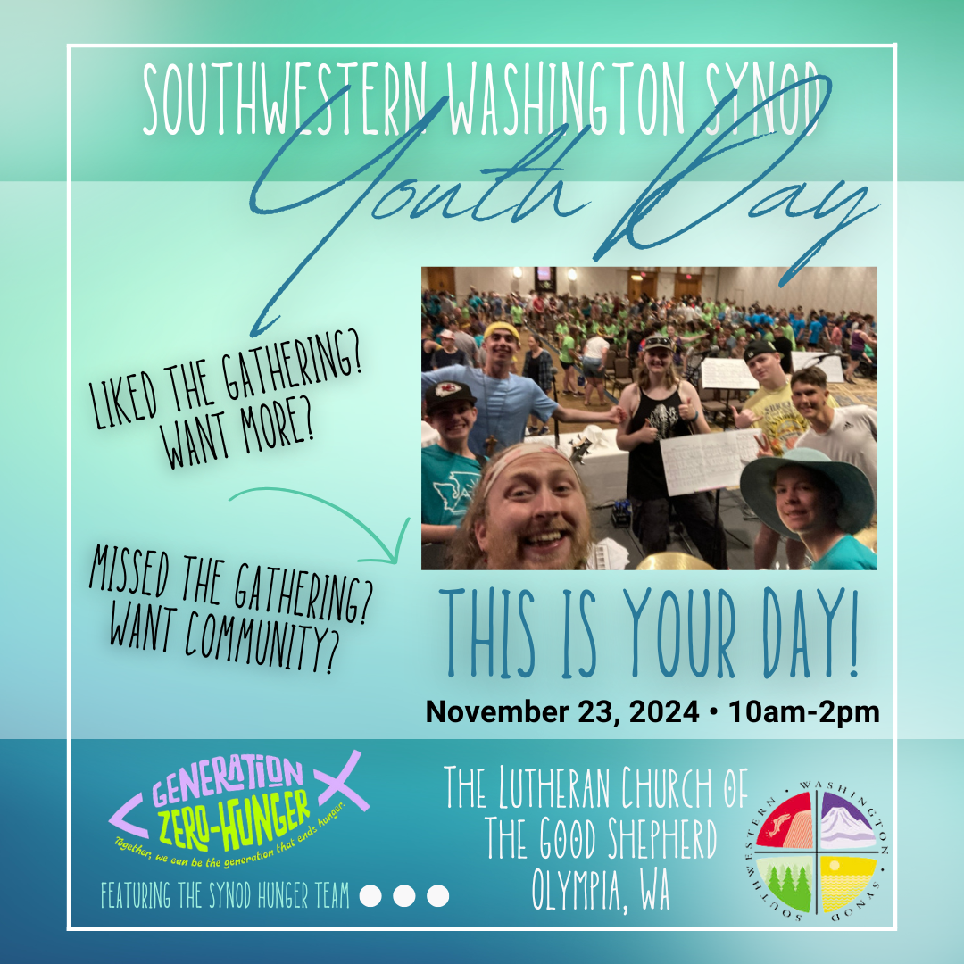 The Synod Youth Day will be held at The Lutheran Church of The Good Shepherd in Olympia, WA on November 23 from 10 am – 2 pm. There is no cost for this event, and you can register (either by youth or as a whole church) at this link.
